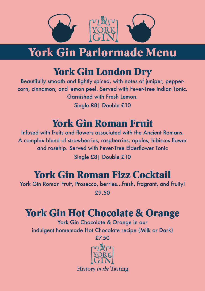 Spanning three floors for stunning views of the city, it is the perfect place to relax and indulge with a slice of cake and a boozy, homemade hot chocolate with our York Gin Chocolate & Orange. If a more traditional G&T is your vibe, try our multi-award winning York Gin London Dry, served with fresh lemon and indian tonic! A favourite amongst the Parlormade staff is the York Gin Roman Fruit, infused with dried fruits and flowers dating back to Roman influence on York. Enjoy either as a classic G&T, or a Roman Fizz cocktail- fresh, fragrant, and fruity, with prosecco and berries!